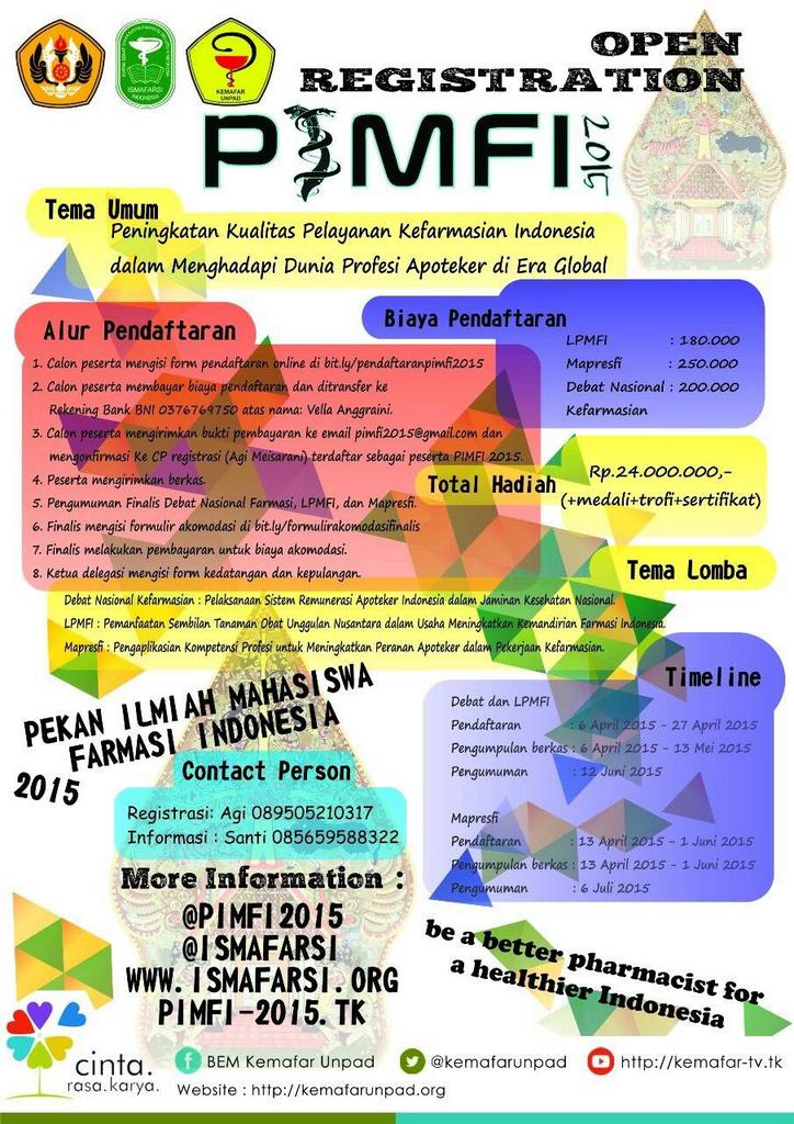 Hai teman-teman mahasiswa farmasi seluruh Indonesia! Pastinya tau kan PIMFI itu apa? ya PIMFI adalah singkatan dari Pekan Ilmiah Mahasiswa Farmasi Indonesia, dan pada tahun ini PIMFI akan diadakan di Universitas Padjadjaran, Bandung! Dalam PIMFI pula akan banyak diadakan perlombaan-perlombaan seputar kefarmasian seperti debat kefarmasian, LPMFI (Lomba Produk Mahasiswa Farmasi Indonesia), Patient Conseling Event, Herbarium, dan masih banyak lagi! Bila teman-teman tertarik untuk mengikuti rangakaian kegiatan tersebut, teman-teman dapat mengkases pimfi-2015.tk untuk informasi lebih lanjut beserta untuk registrasi.